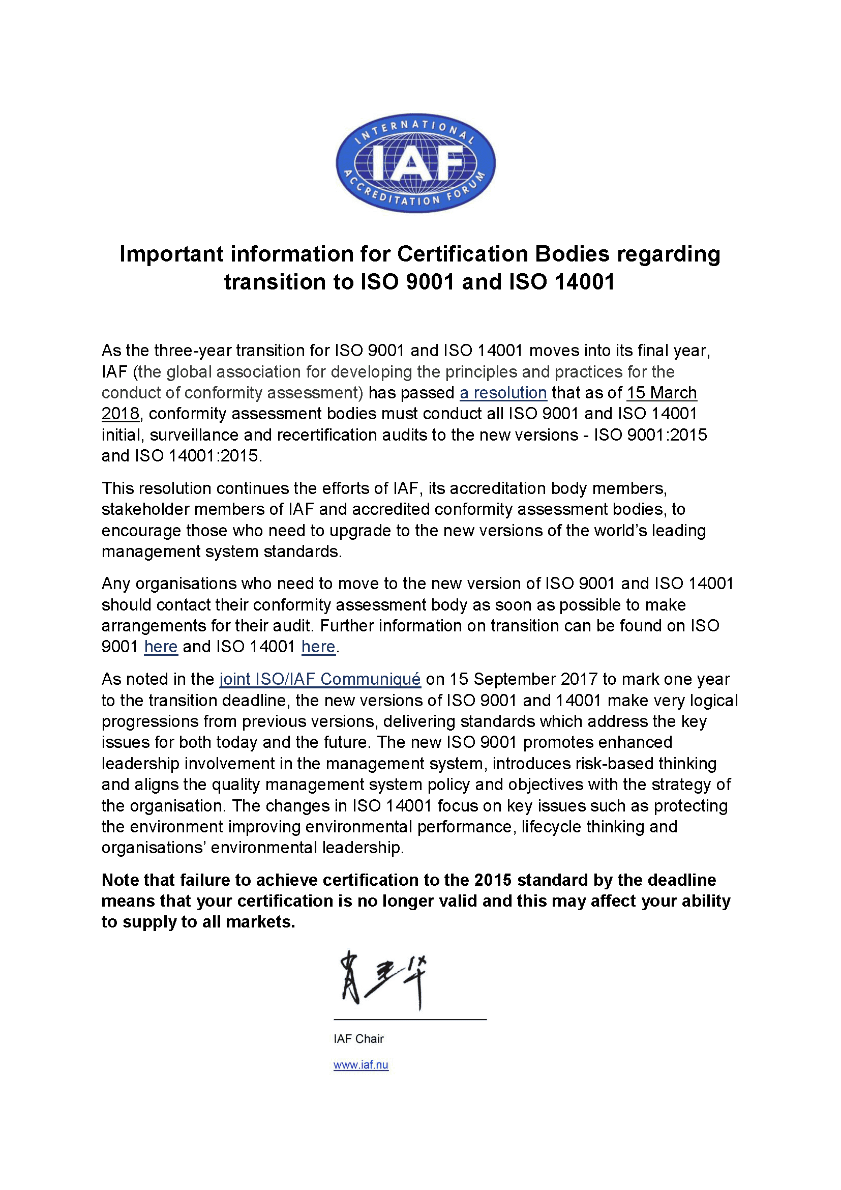 IAF官網(wǎng)發(fā)布了《對認證機構(gòu)實施ISO 9001:2015及ISO 14001:2015轉(zhuǎn)版認證的重要通告》。要求自2018年的3月15日起,認證機構(gòu)對實施的所有ISO 9001及ISO 14001認證必須按新版執(zhí)行,包括初次審核、監(jiān)督審核及換證審核。