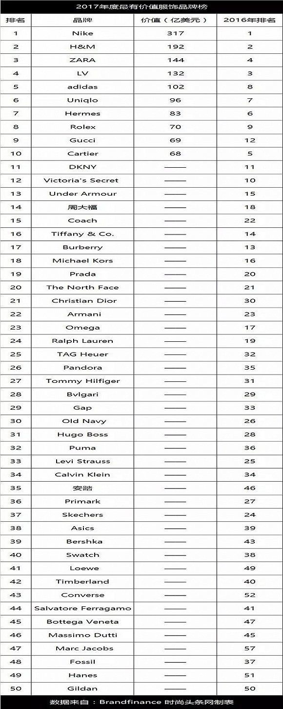以下是Brand Finance《2017全球最有價(jià)值服飾品牌榜》50強(qiáng)名單: