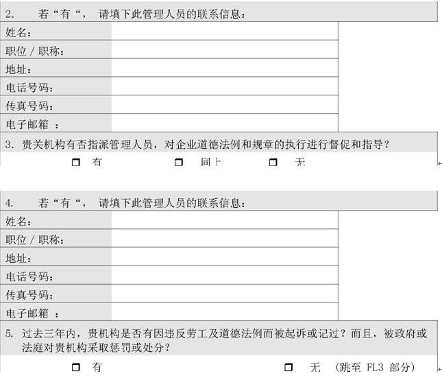 以下從FL4 到FL11, 著重了解“問題2”中,勞工和道德管理的各項規(guī)章。從FL12 到FL13, 著重于了解貴機構(gòu)的管理系統(tǒng)。