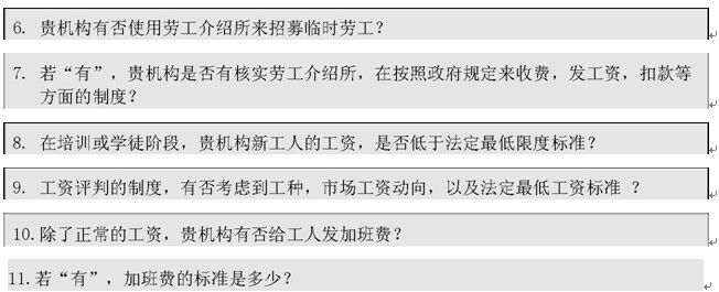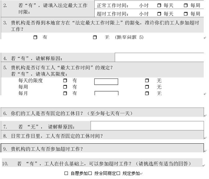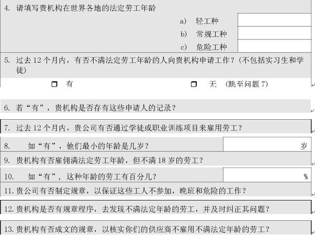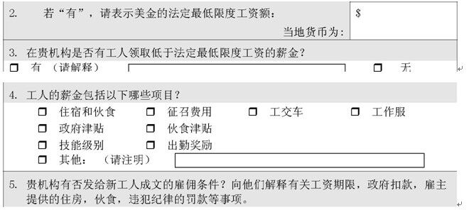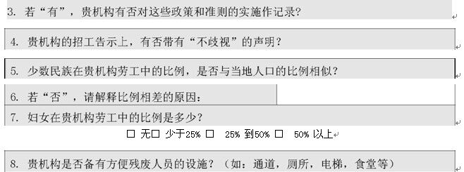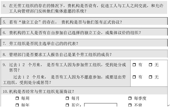3. 貴機構(gòu)的勞工和道德制度文件,是否已用不同的語言,向當?shù)貏诠ば麄髑宄?勞工□ 自由挑選職業(yè)□ 有□ 無□ 不征用童工□ 有□ 無□ 不歧視□ 有□ 無□ 人道的待遇□ 有□ 無□ 法定最低限度工資□ 有□ 無□ 工時□ 有□ 無□ 自由組織社團□ 有□ 無